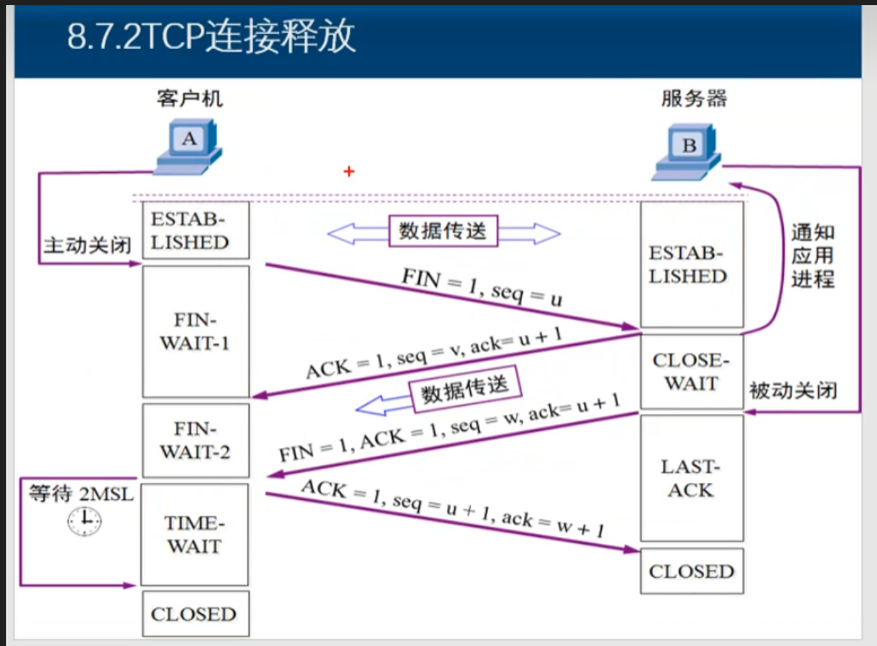 A和B建立连接后状态是ESTABLISHED,A计算机想主动释放连接,发送一个数据包(FIN=1,seq=u),状态进入FIN-WAIT-1状态。B计算机收到后,发送一个确认数据包(ACK=1,seq=v,ack=u+1),状态变为CLOSE-WAIT,然后通知应用程序关闭。A计算机收到这个数据包之后,状态变为FIN-WAIT-2。等到B计算机的应用程序关闭后,给A计算机发送一个数据包(FIN=1,ACK=1,seq=w,ack=u+1)。A计算机收到这个数据包之后,状态变为TIME-WAIT,等待2MSL(两倍的最长报文时间)变为CLOSED状态。并且,A计算机给B计算机发送一个数据包(ACK=1,seq=u+1,ack=w+1),B计算机收到这个数据包后就进入CLOSED状态。