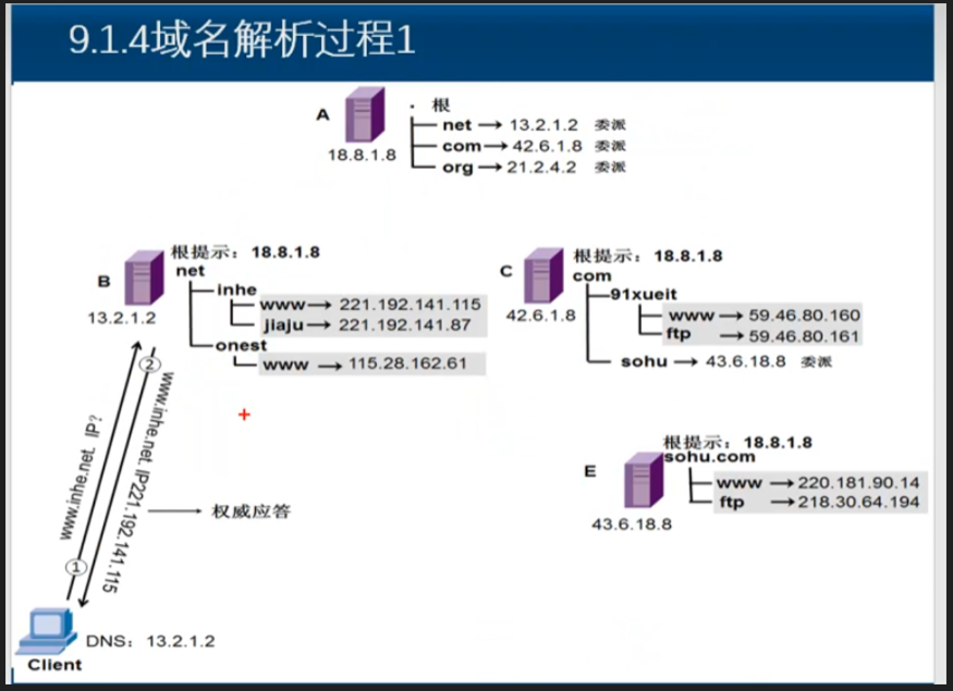 客户端配置的DNS地址是13.2.1.2,如果要访问www.inhe.net,会向DNS服务器发送请求。DNS服务器一看域名是以.net结尾的,正好自己负责,于是将IP地址返回。