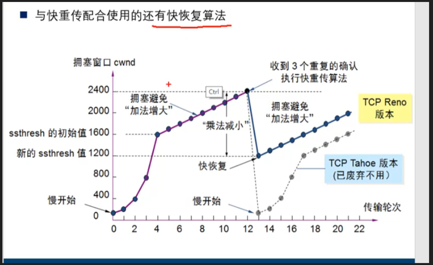 一开始使用慢开始指数增长,达到拥塞阈值后拥塞避免线性增长。当出现数据丢包时,发送方会收到接收方3个重复的确认,于是执行快重传算法。同时,发送窗口初始大小变为出现丢包时窗口的一半(而不是直接变为1,这就是快恢复),然后以后每一个轮次,发送窗口线性增长。