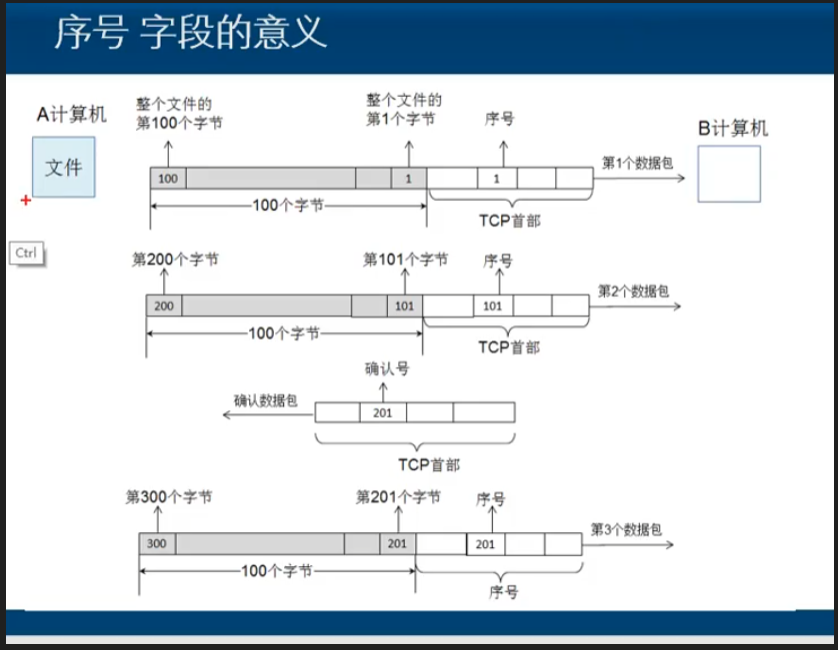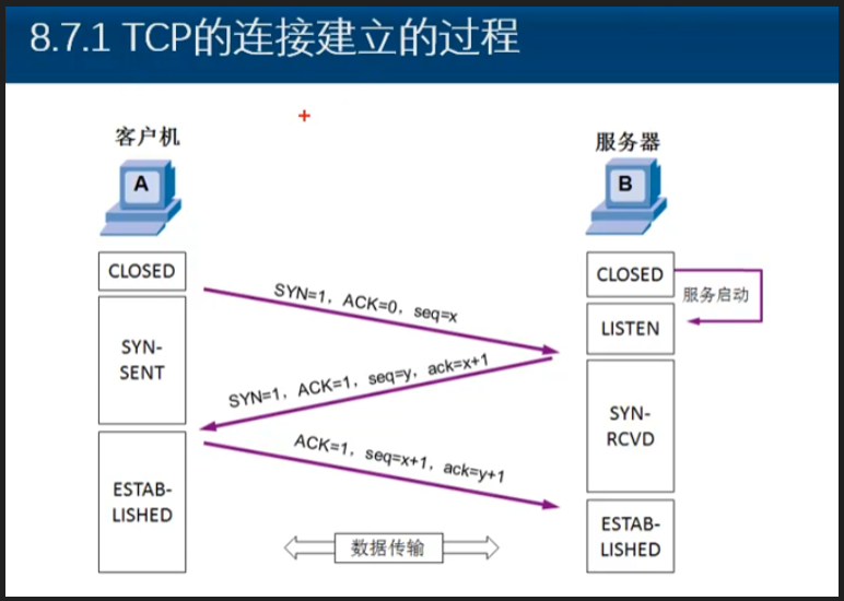 B计算机是服务器,服务启动后状态处于LISTEN监听状态。A计算机给B计算机发一个连接请求(SYN=1,ACK=0,seq=x),然后A计算机进入SYN-SENT状态,B计算机收到请求后给A计算机一个确认(SYN=1,ACK=1,seq=y,ack=x+1,y表示B计算机发送的序列,x+1表示A计算机的x已经收到了,期待A计算机发送x+1),然后B计算机进入SYN-RECEIVED状态,A计算机收到B计算机的确认后,再给B计算机发送一个确认的确认(SYN=0,ACK=1,seq=x+1,ack=y+1,x+1表示A计算机发送x+1数据,y+1表示A收到B发送的y,期待B发送y+1),然后双方建立连接,状态为ESTABLISHED。