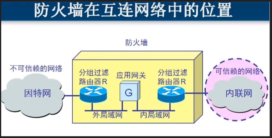防火墙内的网络称为"可信赖的网络",防火墙外的网络称为"不可信赖的网络"。