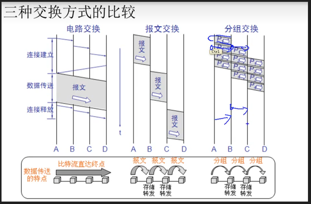 电路交互方式,线路是独占的,不允许其他人访问;分组交换方式是共享的。