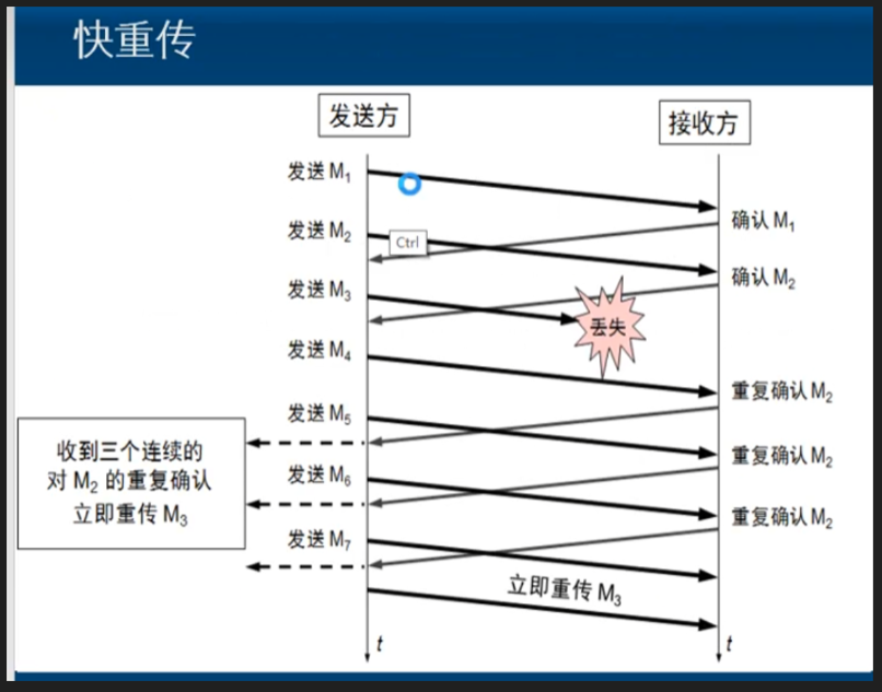 发送方发送了M1、M2两个数据包,接收方给出确认。发送方发送M3、M4数据包,M3数据包在传输过程中丢了,M4数据包没丢,接收方收到M4数据包之后就会认为网络出问题了。接收方这个时候最好是立即告诉发送方要重发M3数据包。这时接收方会给发送方立即发送3个重复确认M2,告诉发送方要立即发M3数据,于是发送方要立即发M3数据。
