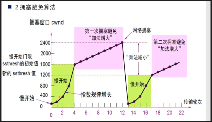 出现数据丢包,表明网络出现拥塞,此时发送方发送频率就不是指数增长了,而是线性增长,每次加1。等到网络拥塞时,用当前拥塞窗口大小2400除以2,计算出来新的满开始门限1200。然后发送端使用慢开始进行发送,达到1200新的慢开始门限后,执行拥塞避免算法。