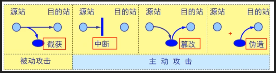 网络安全的四个威胁:截获、中断、篡改、伪造。