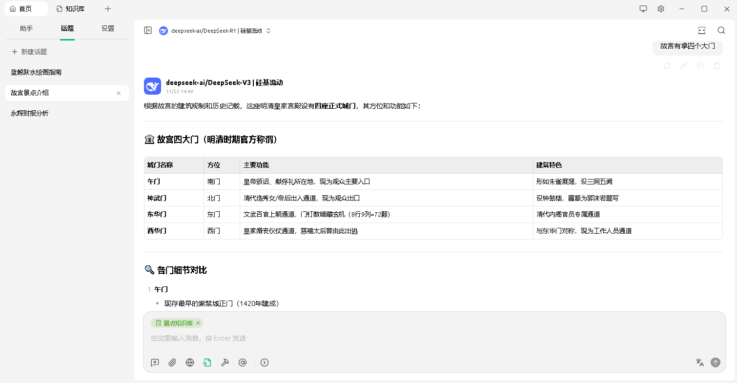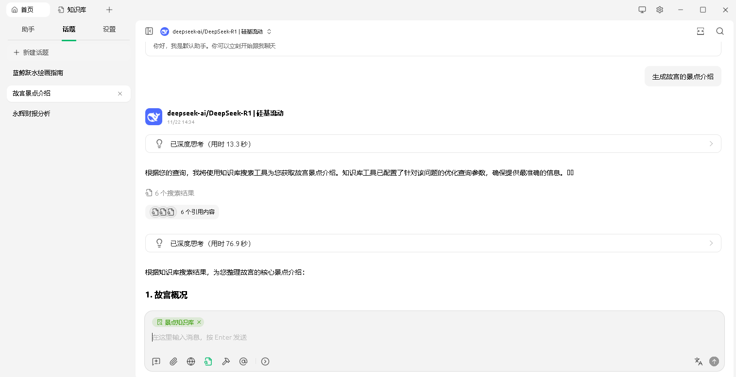 当你进行提问的时候,他会自动去解锁知识库优先使用知识库里面的内容,我选的这个模型是比较小的,所以整体而言,他的提问的质量不是特别的高