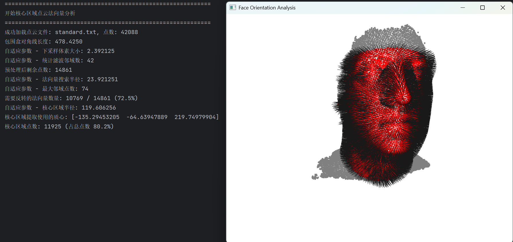 pythondef visualize_result(self, core_pcd): """可视化结果:原始点云+核心区域+核心区域法线""" if self.pcd_clean is None or core_pcd is None: print("数据不完整,无法可视化!") return # 设置颜色:原始点云灰色,核心区域红色 self.pcd_clean.paint_uniform_color([0.5, 0.5, 0.5]) core_pcd.paint_uniform_color([1.0, 0.0, 0.0]) # 为了只显示核心区域的法线,我们需要将原始点云的法线设置为0 # 创建一个没有法线的原始点云副本用于可视化 pcd_no_normals = o3d.geometry.PointCloud() pcd_no_normals.points = self.pcd_clean.points pcd_no_normals.paint_uniform_color([0.5, 0.5, 0.5]) # 创建几何体列表 geometries = [core_pcd,pcd_no_normals] o3d.visualization.draw_geometries( geometries, window_name="Face Orientation Analysis", width=1000, height=800, point_show_normal=True # 显示法向量(但只有核心点云有法向量) )显示核心区域法线