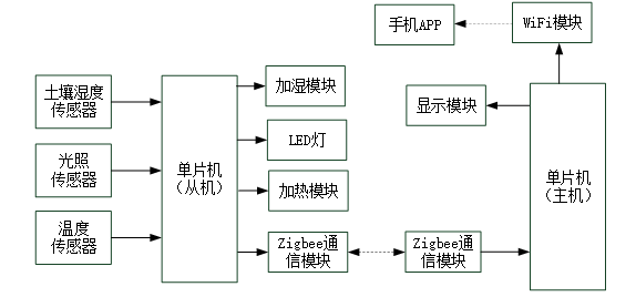 本设计基于ZigBee的温室智能控制系统,其整体系统结构框图设计如图2.1所示,包括从机和主机两个部分,两者均已STM32的单片机作为主控制器,其中,从机部分由YL-69土壤湿度传感器、DS18B20温度传感器、光照传感器、LED灯、加湿模块、加热模块、Zigbee通信模块构成。其能够实时监测温室环境的温度、土壤湿度和光照强度,为精确调节温室环境提供数据依据。根据实时监测到的环境数据,系统能够智能化地进行调节,如光照不足时进行补光,土壤湿度过低时进行加水,为植物生长创造最佳环境。利用Zigbee通信模块,从机可以将检测到的数据传输到主机,实现无线传输,方便灵活。