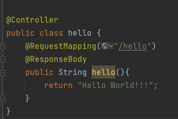- 编写 Controller:用 @Controller 和 @RequestMapping ("/hello") 定义接口,@ResponseBody 返回字符串 "Hello World!"。