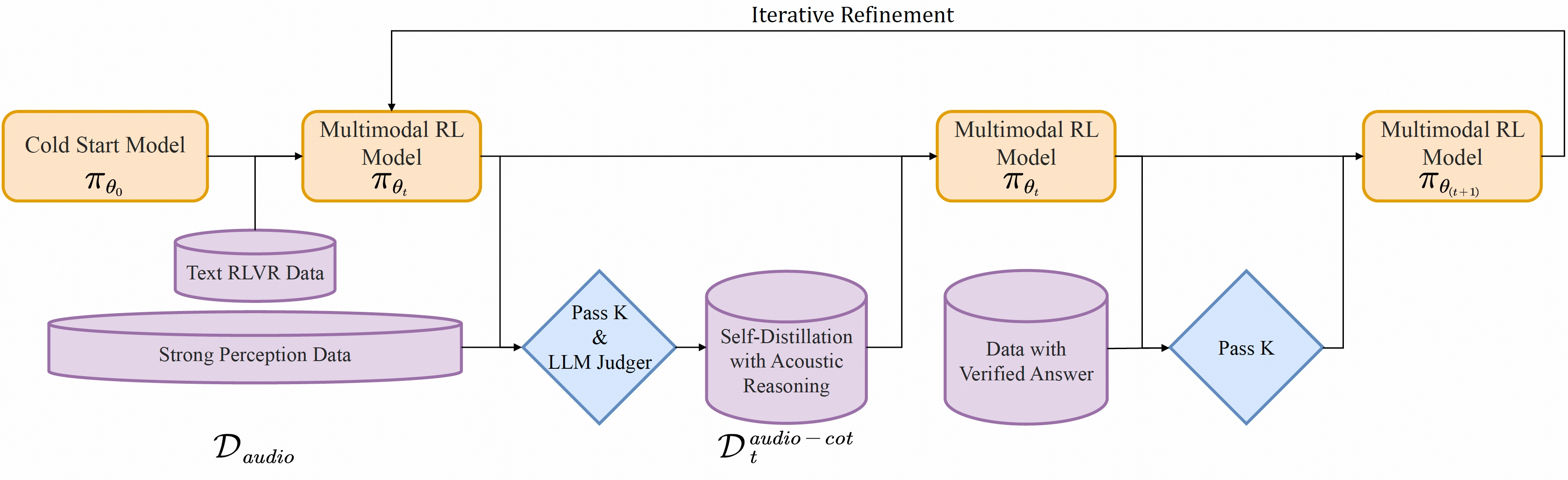 关键创新在于我们的训练方法------模态锚定推理蒸馏(MGRD)。该方法通过迭代优化模型的思维过程,逐步强化其与底层音频特征的关联,直至形成**"原生音频思维"**。