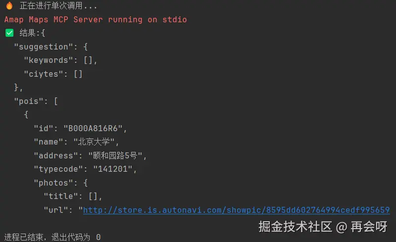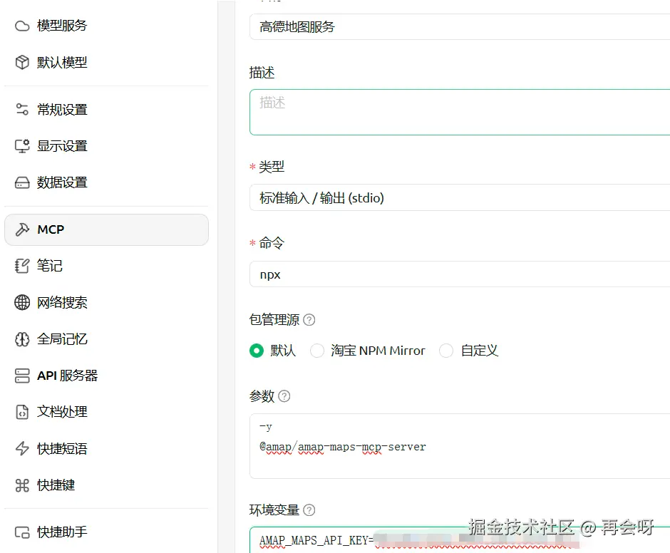 当你运行一个MCP 工具(例如Node.js 的高德地图服务时),系统会: