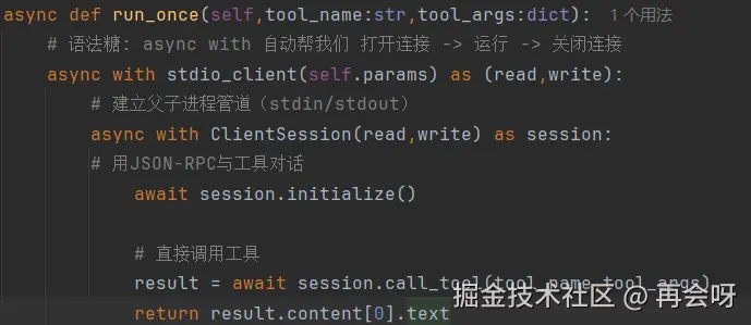 看:这就是MCP。工具不在本地,甚至不是我们写的,但Agent却能直接调用。现在,我们要用Python 代码来实现这个神奇的过程。