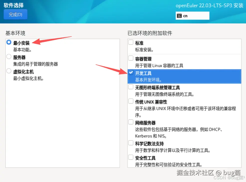 openEuler 系统安装分为三种类型Minimal Install、Server、Virtualization Host ,使用 Minimal Install 安装,选择安装"Development Tools" 组工具包