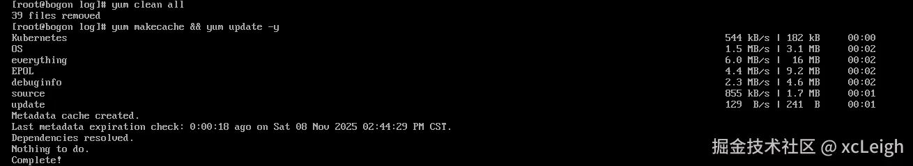 yum clean all清理本地缓存的软件包信息,避免旧缓存导致更新失败。yum makecache重新生成软件包缓存,提高更新速度;yum update -y自动更新所有可更新的软件包(包括内核补丁、安全修复包),-y表示自动确认所有操作,无需手动输入"y"。