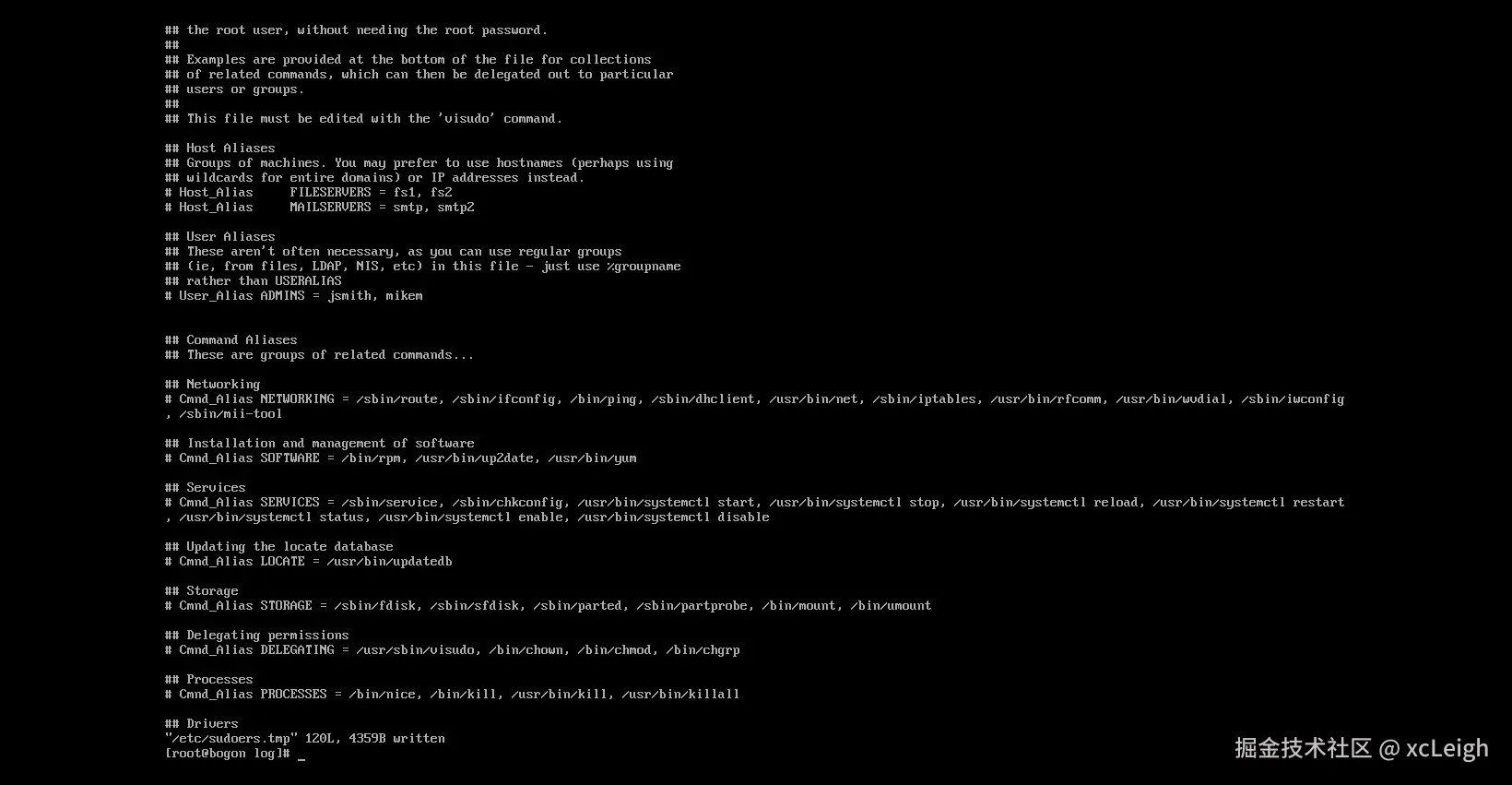 visudo是编辑 sudo 配置文件(/etc/sudoers)的专用命令,会自动校验语法,避免配置错误导致 sudo 失效。- 配置项