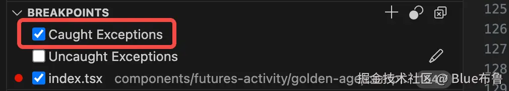 在断点面板中开启Caught Exceptions,即可在有异常时,自动断点到错误代码行处~