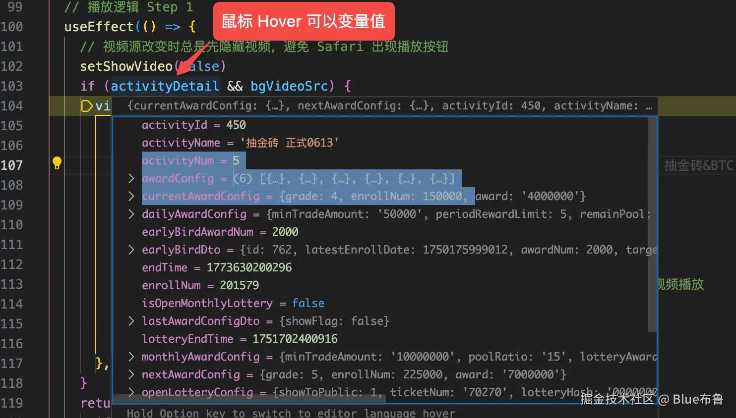此时在对应代码行数前端点击一下,出现红点时即 打断点 成功,此时刷新页面即可看到代码停在这里,可以鼠标 Hover 查看对应变量值,也可以选择 Step Over (F10) 代码一步一步执行,可以看到代码详细的执行逻辑。