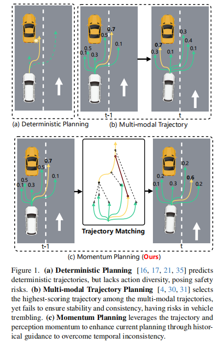 图 1 三种规划方法的对比:(a) 确定性规划缺乏多样性;(b) 多模态规划存在时间不一致性;(c) MomAD 的动量规划通过历史信息引导实现稳定连贯的轨迹。