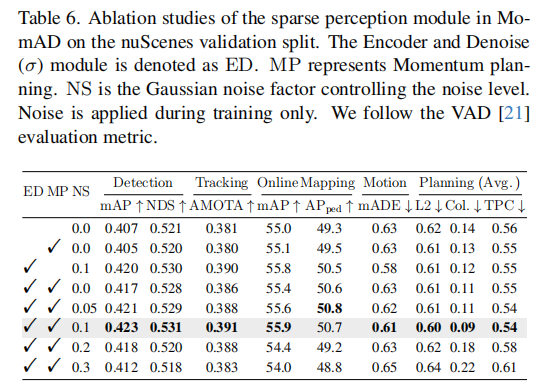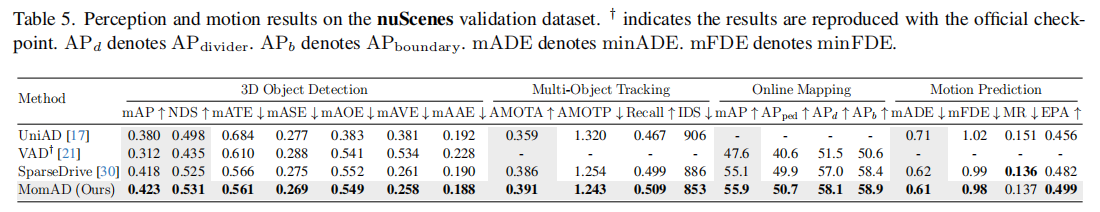 表 5 展示了 MomAD 在感知任务(3D 目标检测、多目标跟踪、在线映射)和运动预测任务上的性能: