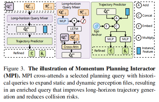 图 3 MPI 通过交叉注意力机制融合当前选中的规划查询与历史规划查询,扩展静态和动态感知范围,提升长时域轨迹生成质量并降低碰撞风险。