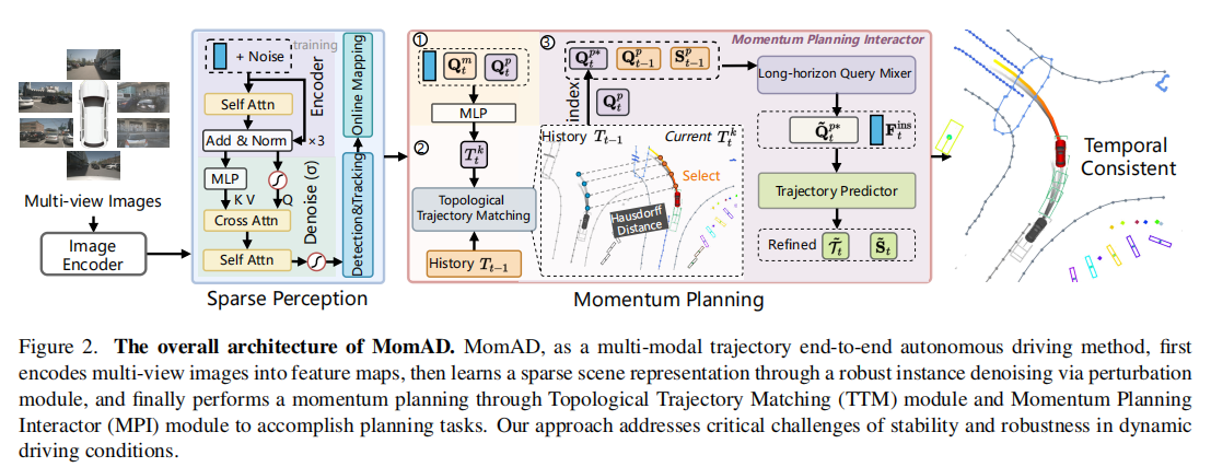 MomAD 的整体架构如图 2 所示,分为稀疏感知模块和动量感知规划模块两部分,核心流程为:多视图图像编码→稀疏场景表示(含去噪)→动量规划(TTM+MPI)→轨迹生成。