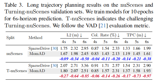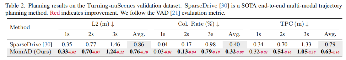 - MomAD 在平均 L2 误差(0.60m)和碰撞率(0.09%)上与 SOTA 方法相当;