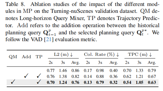 表 8 展示了 MPI 中不同组件(QM:长时域查询混合器,Add:直接相加,TP:轨迹预测器)的作用: