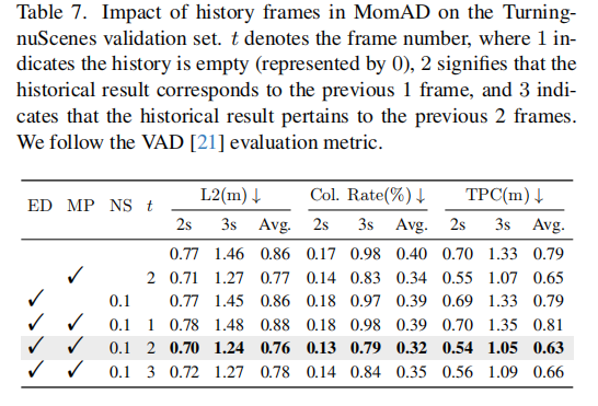 表 7 展示了历史帧数量(t=1:无历史,t=2:1 帧历史,t=3:2 帧历史)对 Turning-nuScenes 的影响:
