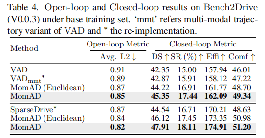 - MomAD 的闭环成功率较 VADmmt 提升 16.3%,较 SparseDrive 提升 8.4%;