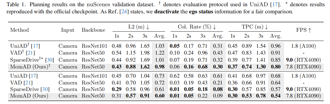 表 1 展示了 MomAD 与基线方法在 nuScenes 验证集上的性能对比: