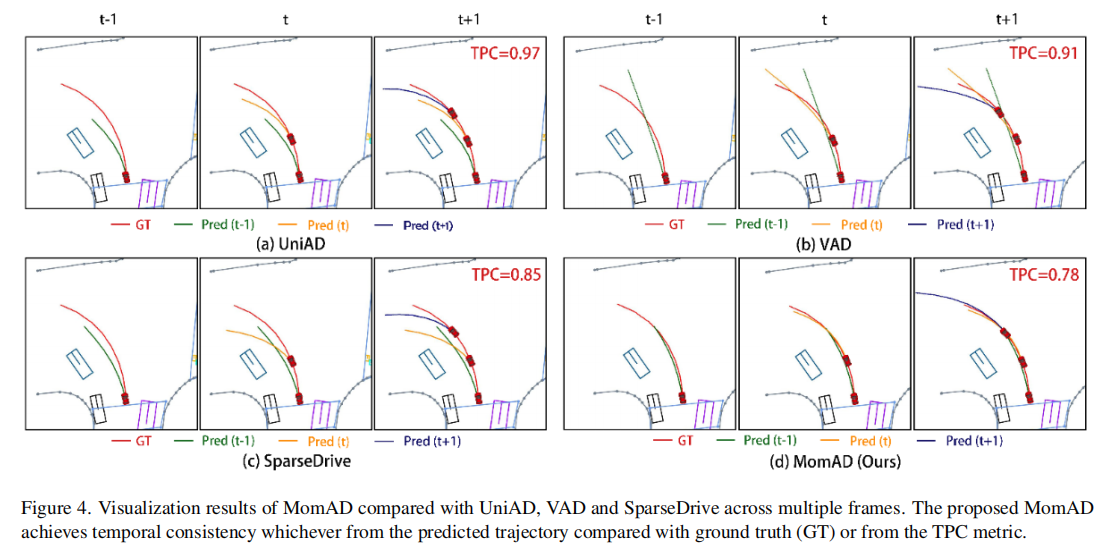 图 4 转弯场景下的多帧可视化:MomAD 的预测轨迹(黄 / 蓝)更贴近 GT(红),且帧间连贯性更好,TPC 值更低;基线方法(UniAD、VAD、SparseDrive)存在轨迹突变或偏离 GT 的情况。