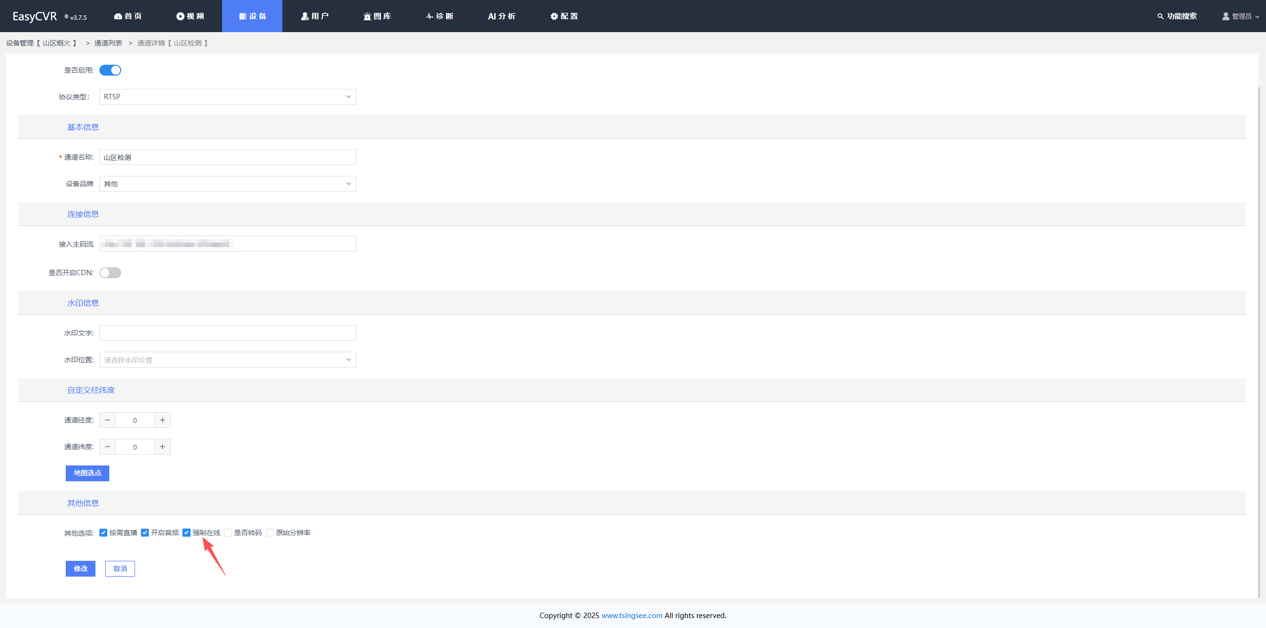 3)平台配置检查: 登录EasyCVR平台,重点检查该故障通道的相关配置。关键发现: 该通道配置中开启了"强制在线"功能。此功能可能导致平台显示的设备在线状态与设备实际的网络可达性不一致。