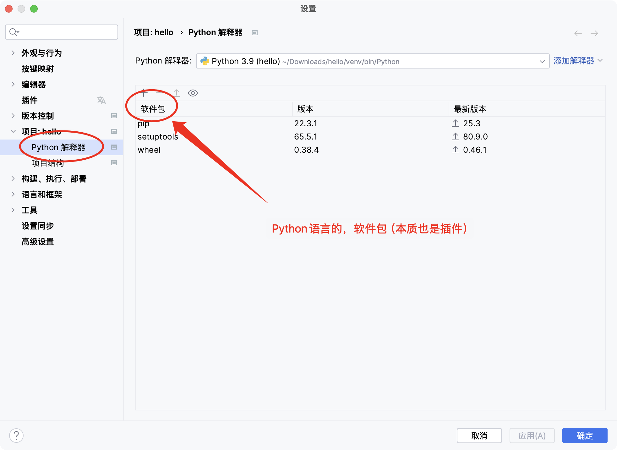 Python 软件包 :在 菜单栏的设置 → 项目 → Python解释器 中,是Python语言的"插件"(JetBrains 官方后来也将"插件"一词优化为"软件包",避免混淆),它常用于解决各种项目的环境依赖