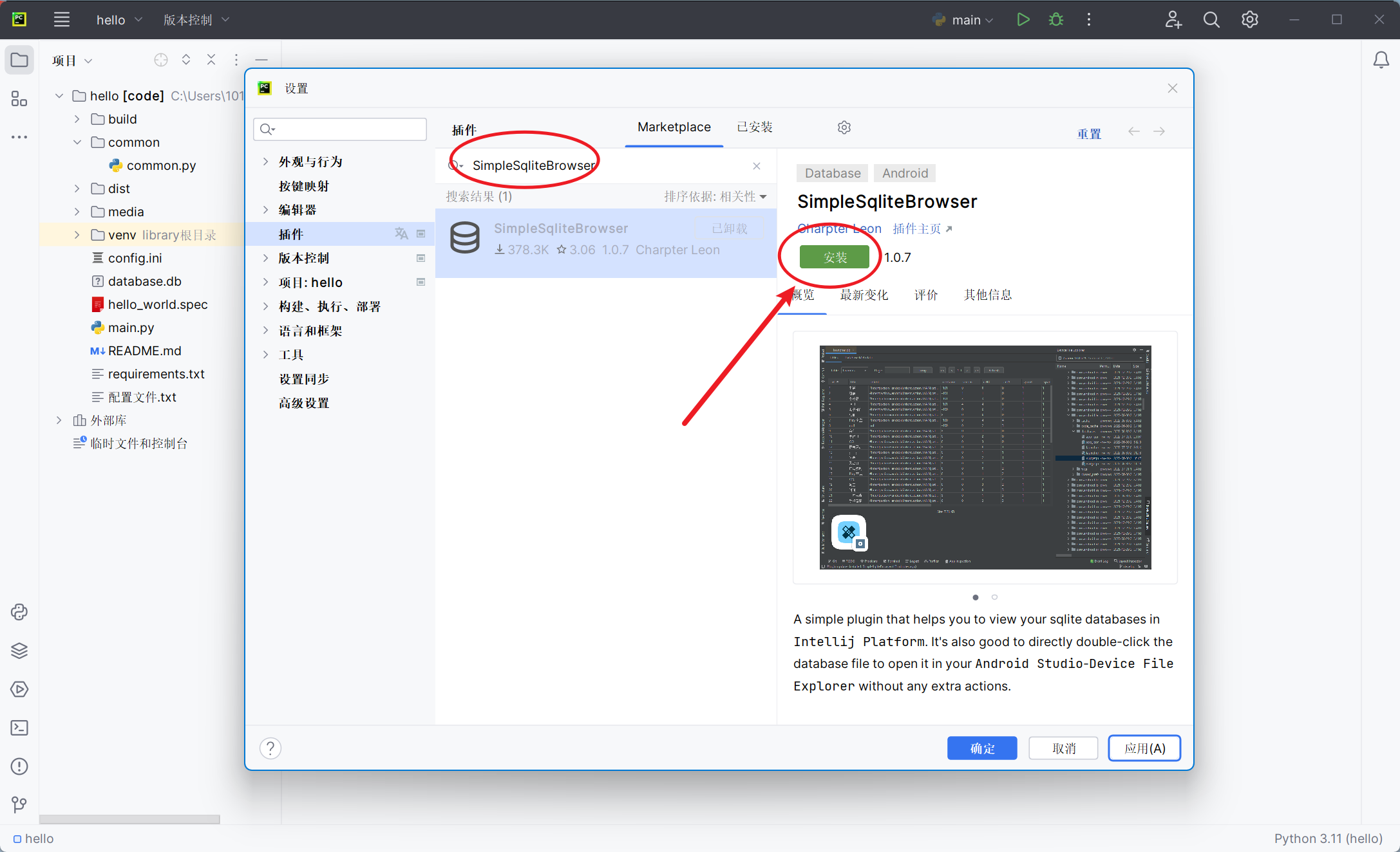 2、在 Marketplace 中搜索 SimpleSqliteBrowser,点击 「安装」