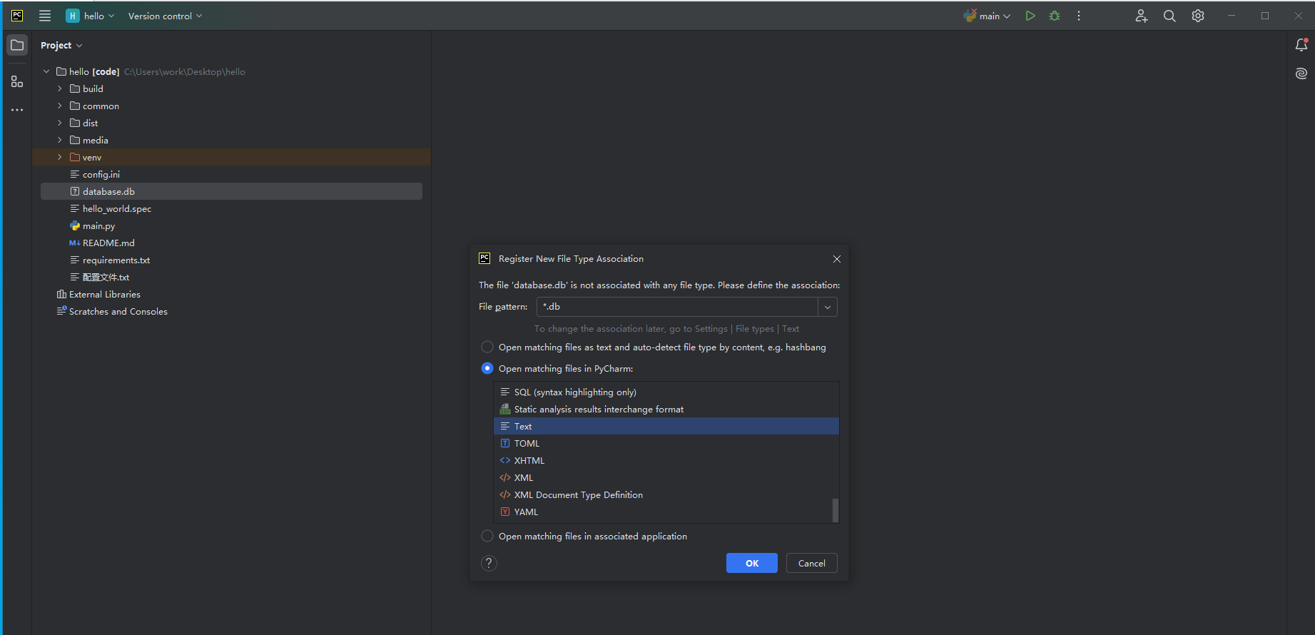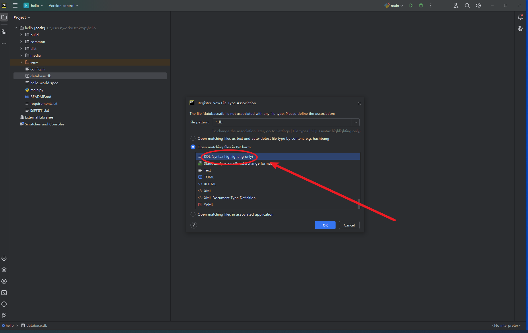当我们在 PyCharm 中双击打开 .db 文件时,会弹出一个选项框,让我们选择打开方式