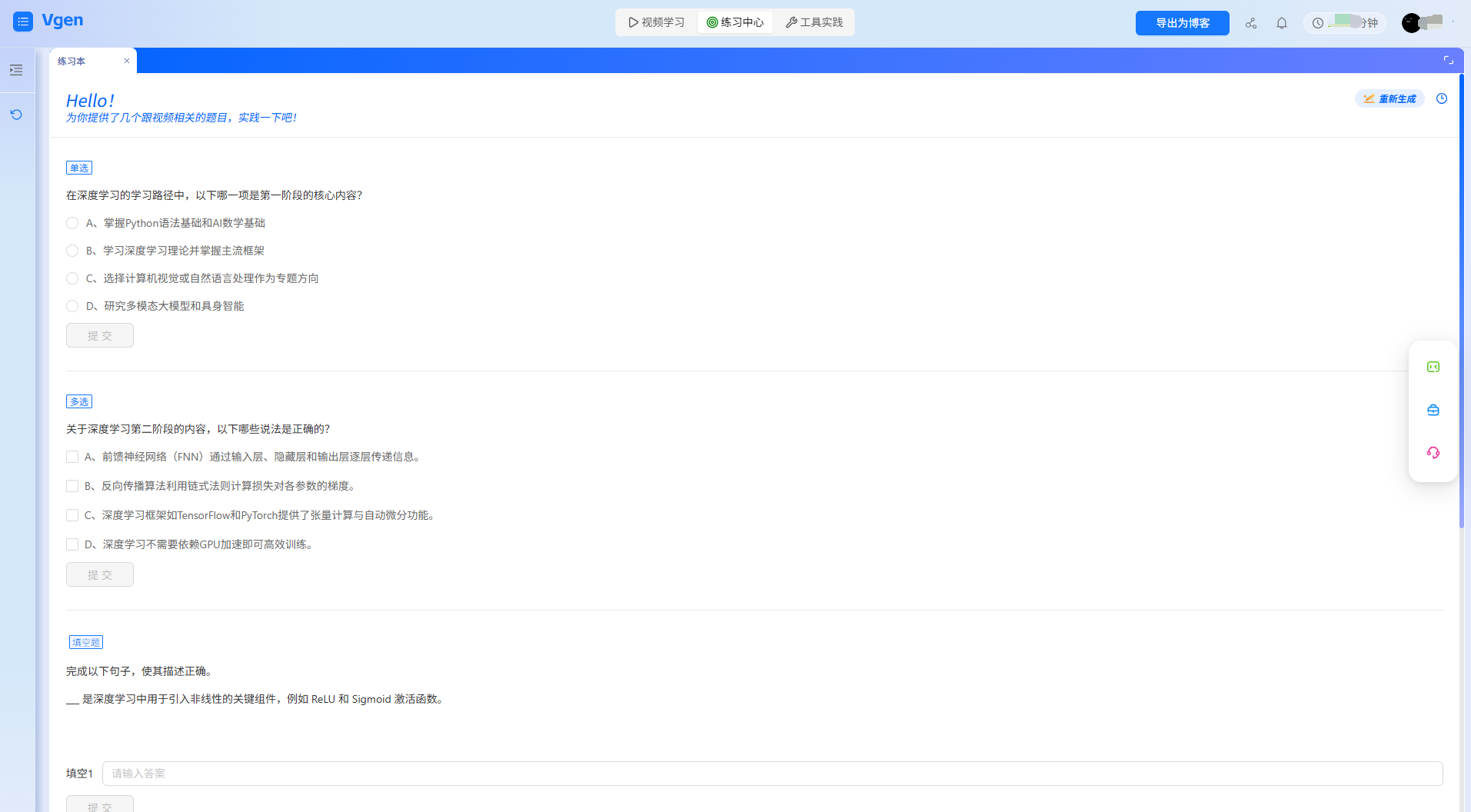 - 生成定制化考题:在实操页面点击"AI自测",视频解析工具根据"视频解析内容+实操代码"生成3类题(共10题,20分钟完成):