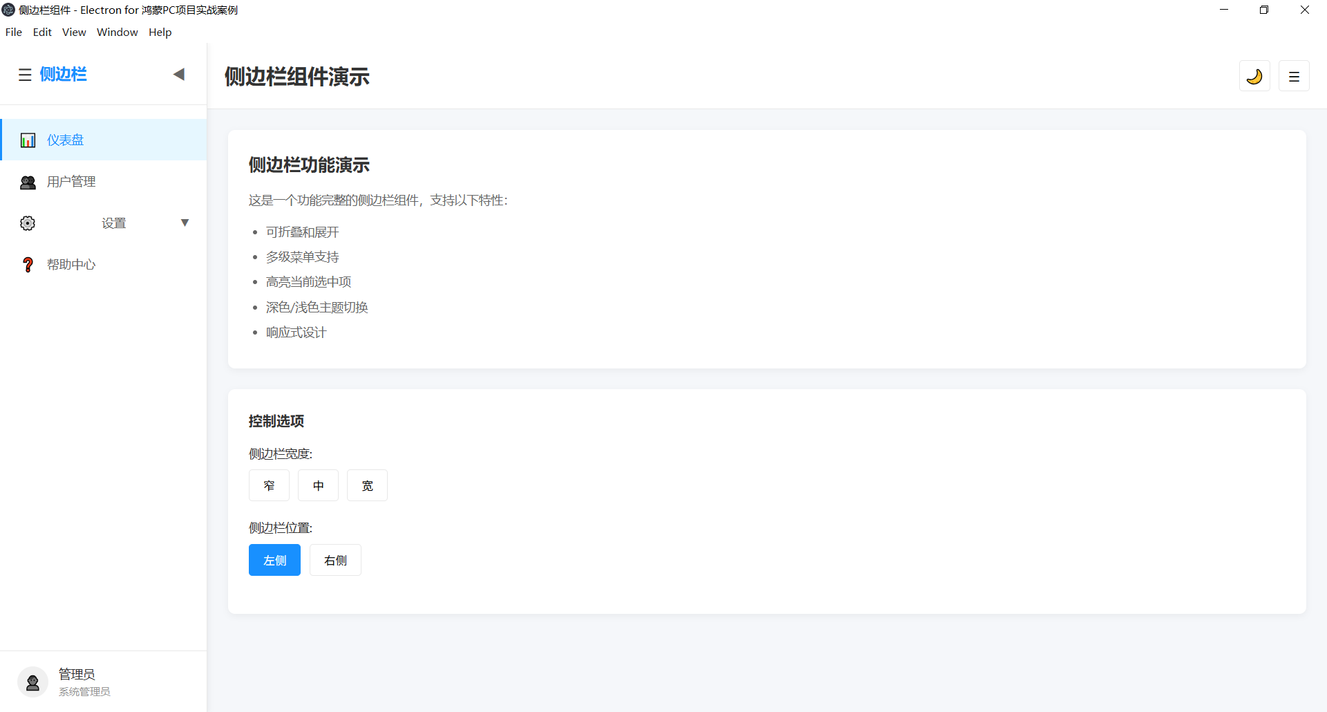 这是一个基于Electron开发的侧边栏组件示例项目,展示了如何在桌面应用中实现功能完善、样式美观的侧边栏导航。该组件支持折叠/展开、多级菜单、主题切换、响应式设计等丰富功能,适用于各类管理系统和桌面应用的界面开发。