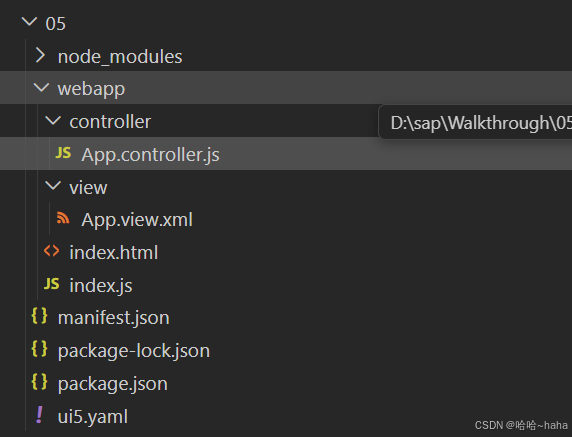 同ui5_Walkthrough_Step 4: XML 视图 新建文件夹05,与04不同的是,这次webapp新增一个文件夹controller,controller文件下新增文件App.controller.js,如下: