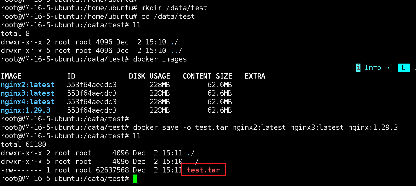 用于将本地镜像打包为 tar 文件的命令,可将一个或多个镜像保存到本地文件系统,方便镜像的备份、迁移或离线传输(如从一台机器复制到另一台机器)。