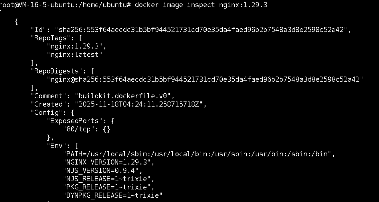 用于查看 Docker 镜像详细元数据的命令,返回镜像的完整配置信息(包括构建层、环境变量、端口、卷、配置指令等),以 JSON 格式输出,帮助深入了解镜像的构成和属性。