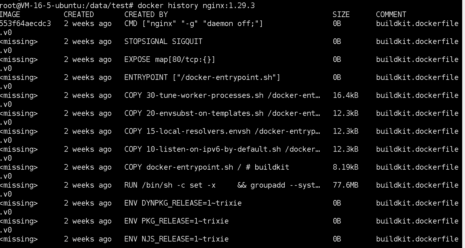 用于查看Docker 镜像的构建历史,展示镜像中每一层(layer)的创建信息,包括每层的指令、创建时间、大小、作者等细节,帮助你了解镜像的构成、优化方向或排查构建问题。