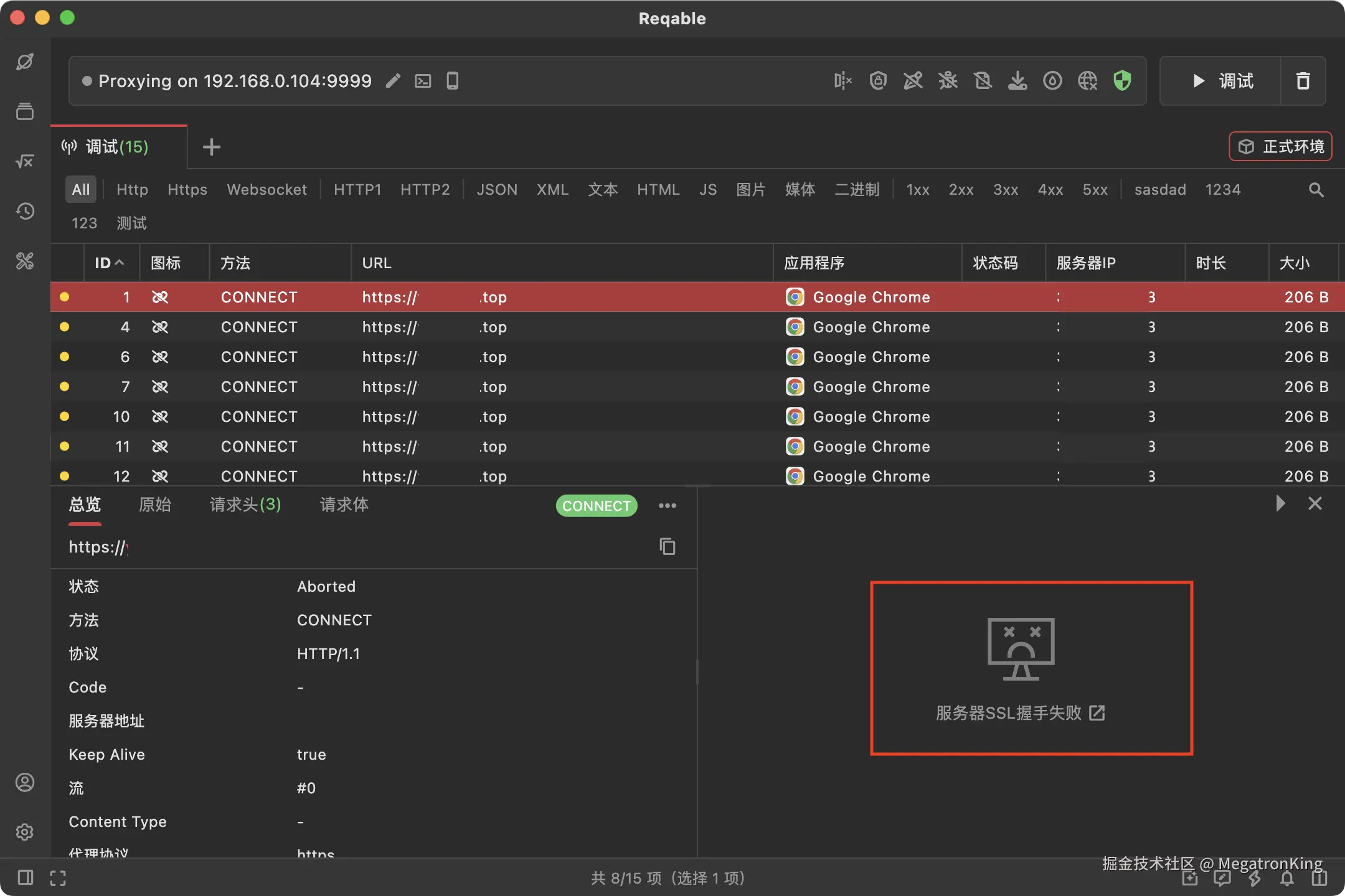 问题还是很容易复现的,打开Reqable启用系统代理并抓包,使用Chrome浏览器访问网站,看到浏览器报错ERR_CONNECTION_CLOSED,Reqable中能看到此域名的流量,但是状态全是黄色警告,点开一条记录提示是服务器SSL握手失败。