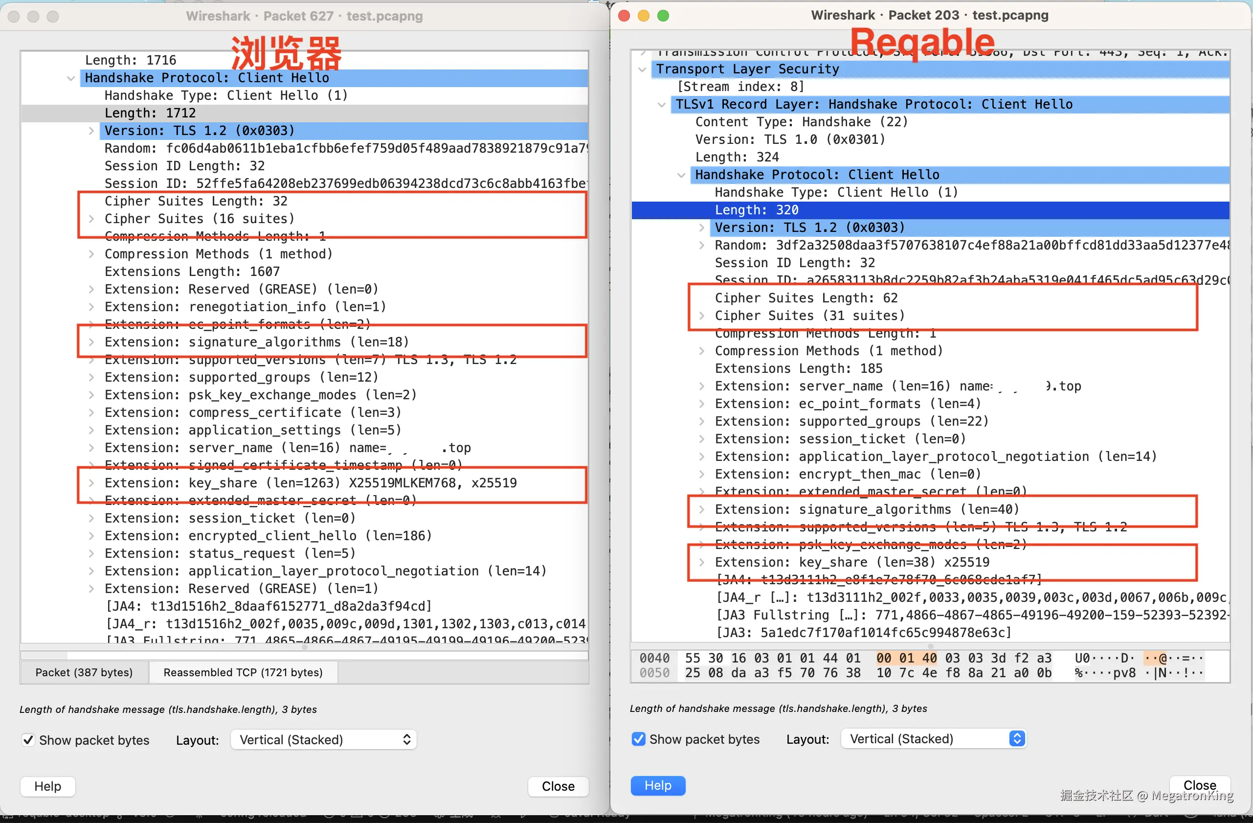 主要是看ClientHello包,里面包含了客户端的SSL各种信息。上图左边是浏览器的数据包,右边是Reqable的数据包。重点观察的部分,我已经用红框标出来了,主要有三个部分。