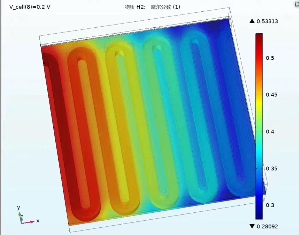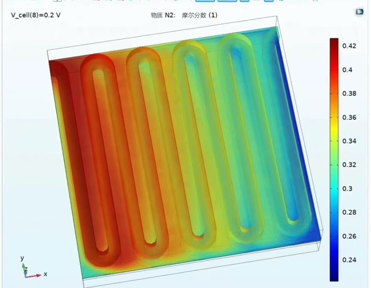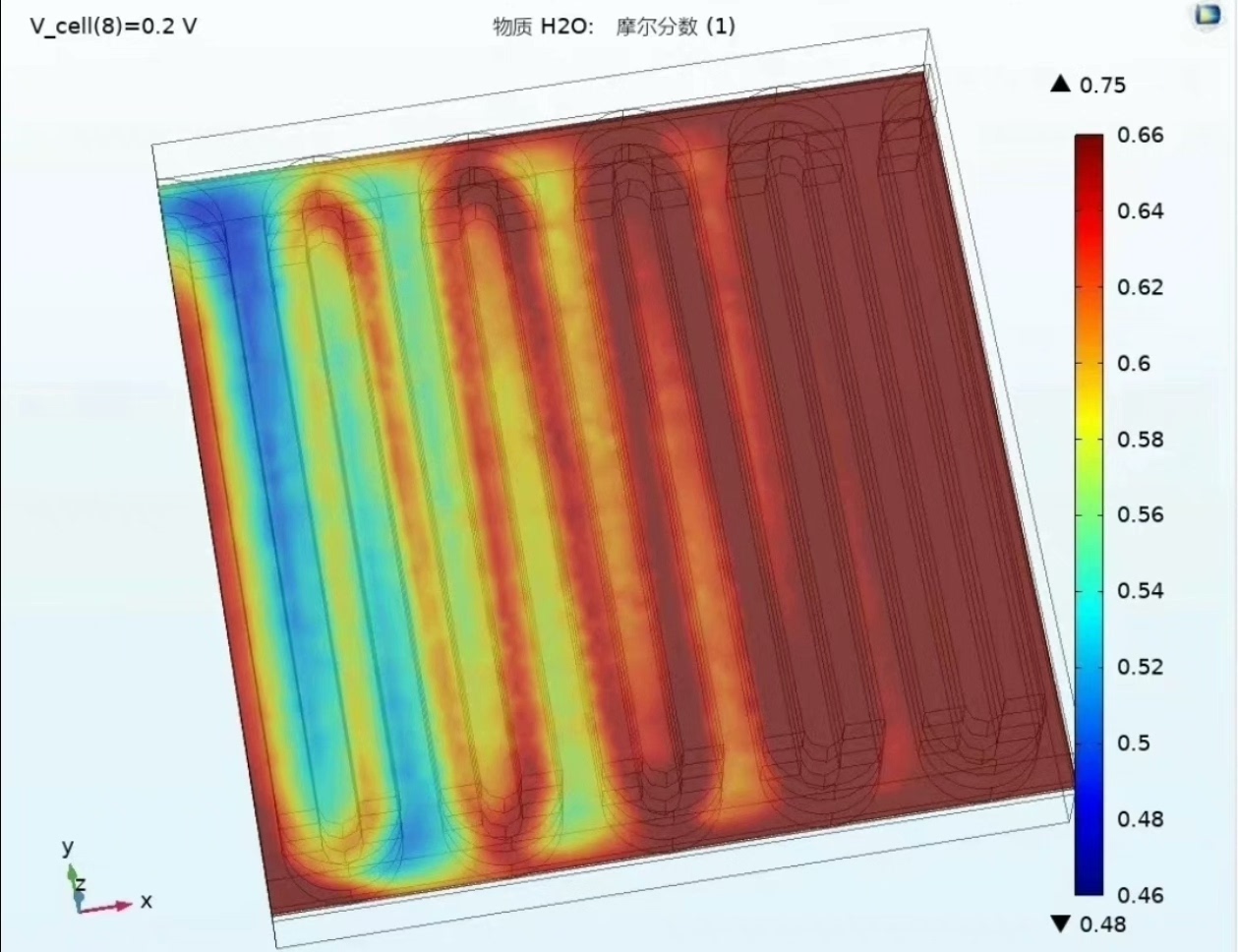 液态水我们做了速率研究,膜态水则做了分布研究。液态水在流道内的传输速率对电池性能影响很大。如果液态水积累过多,会堵塞流道,阻碍反应物传输;而液态水过少,又可能影响膜的湿润程度。在COMSOL里,通过建立相关的流体动力学方程来描述液态水速率,像Navier - Stokes方程: