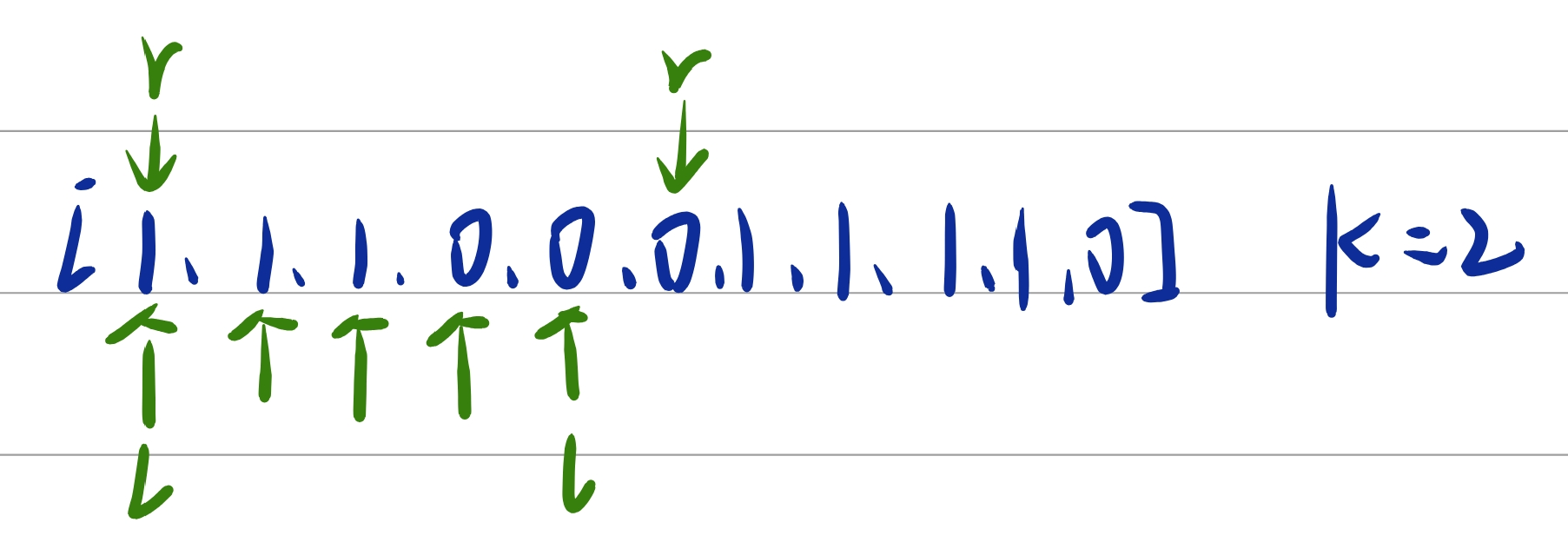 我们right移动到第三个0的时候,窗口就不合法了,我们将left继续向右移动,(暴力枚举是让l移动一位,然后r再从左往右移动)优化之后,l一直向右移动,r不变,直到r和l的区间中0的个数不大于2,这样我们就会发现,l和r是同向移动的,因此,可以使用滑动窗口。