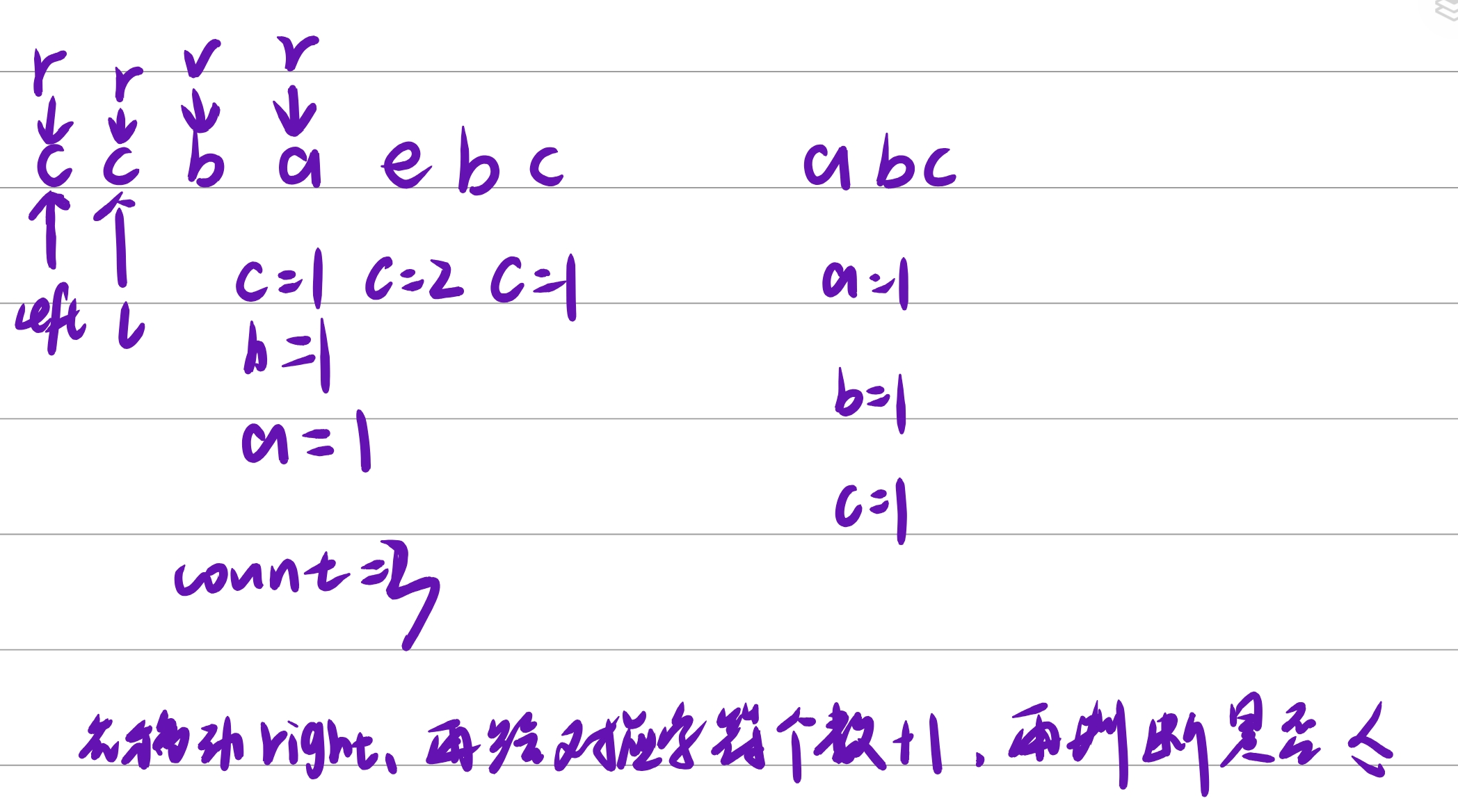 hash[s[left++]]--; //出窗口---为什么出窗口一定要让字符的个数减一? 因为出了之后就不会再算这个字符就会再开始新的一轮的计数 所以必须要减一
