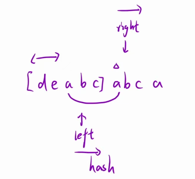 while(hash[s[right]] > 1) //判断---right从左往右遍历字符,当字符个数大于1时,就代表left和right中间的字符串有重复的字符了,上一次right的位置的字符的长度就是可以保留的,现在就要让left指向的字符出窗口(以left为左边的字符串已找到最大值)