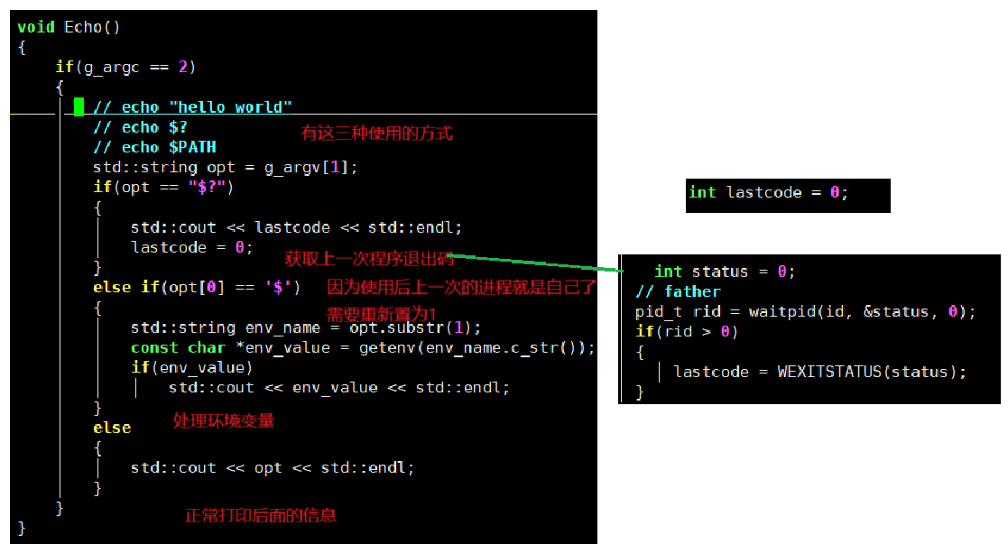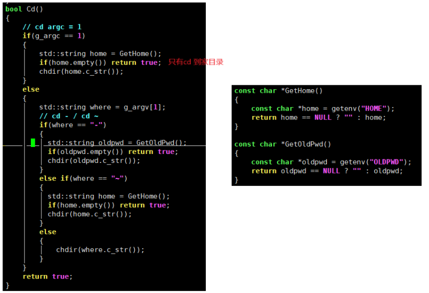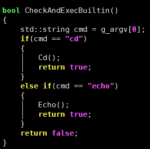 所以在执行程序之前我们需要先拿这个命令行参数表,来判断一下命令是否为内建命令,如果是内建命令就不用创建子进程进行程序替换了,直接由父进程来执行内建命令,下面就处理cd和echo内建命令。