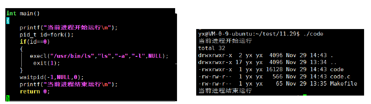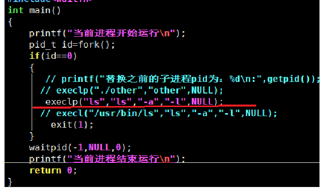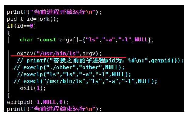 如下代码,创建了一个子进程,让子进程来替换为ls命令,如果替换失败子进程直接结束,子进程结束之后父进程在回收子进程之后父进程的代码还可以继续执行。