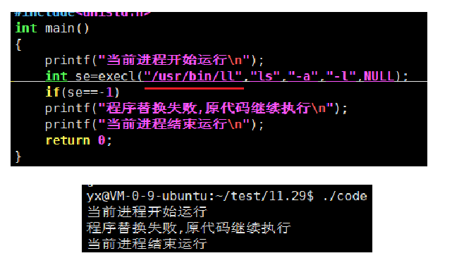 而替换失败了会继续执行后半部分的代码,而execl只有发生错误才会有返回值-1,因为如果没有错误就去执行新的代码了,那它返回值也就没有意义了。